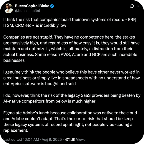 “The risk that companies rebuild their systems of record is low… The real risk is better, AI-first versions beating legacy SaaS.” — Bucco Capital